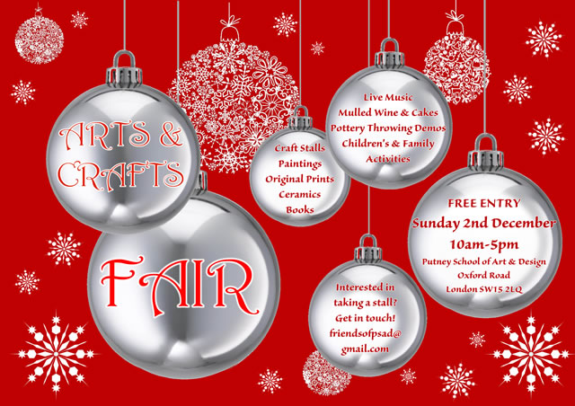 The Putney School of Art and Design are holding an arts and crafts fair on Sunday 2 December from 10am to 5pm. There will be craft stalls, paintings, original prints, ceramics, books