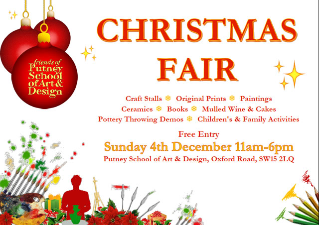 Come to your local art school, Putney School of Art and Design in Oxford Road, for the Christmas Fair (organised by the Friends of Putney School of Art and Design).