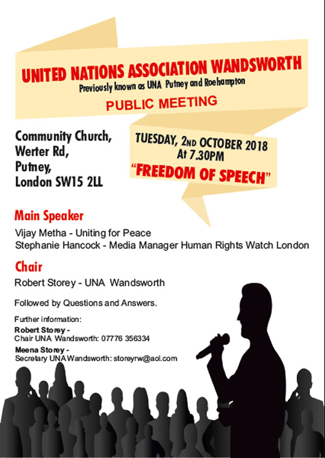 The next meeting of the Wandsworth branch of the United Nations Association (UNA) will be entitled 'Freedom of Speech.