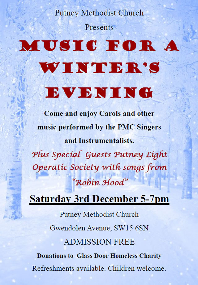 Saturday 3rd December 5-7pm at Putney Methodist Church, Gwendolen Avenue, SW15 6SN.
