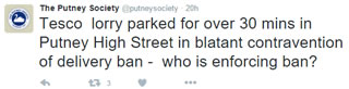 Judith Chegwidden, the Chair of Putney Society said, "The 7am-7pm limit on deliveries should help to keep traffic moving in the High Street and anything which achieves this is likely to improve air quality. The council consulted widely and businesses were thought to have signed up - but it seems Tesco (at one of the narrowest points in the High Street) has decided that the ban is irrelevant. It is extraordinary that in a week when Putney High Street hit the news as a result of its poor air quality, that Tesco should consider it acceptable to ignore the delivery ban and contribute to the congestion which is a significant cause of air pollution".