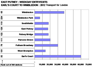 The meeting also covered East Putney Station, which in 2012 had over 5.2 million passengers enter and exit through its gates. The spokesman for TfL agreed that the station was in poor condition & that lifts should be installed , however it would not be before 2016 as the station is not ranked as a priority project. On weekday journeys from Earls Court to Wimbledon East Putney is one of the least busy stations with under 20,000 passengers.
