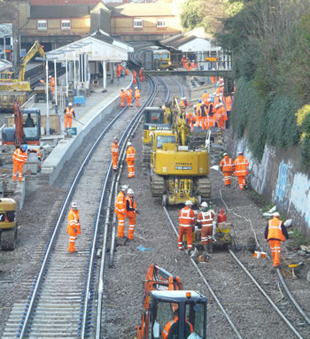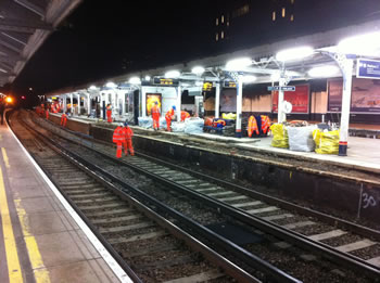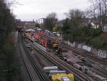 For many weeks now, contractors working for Network Rail have been busy lengthening the platforms at stations between Waterloo and Windsor. The contract was due to be concluded by 31 December 2011. Strangely, virtually nothing seemed to be happening at Putney itself. But everything changed when train services ceased on Christmas Eve. A small army then moved in to make the station ready for trains of ten coaches, rather than the current maximum of eight coaches. Working 24 hours a day, it looked as if the job would be completed in time for normal services to resume on the morning of 3 January. With no services on Christmas Day nor Boxing Day, initially work was focused on the island platform in the middle of the station: platforms two and three. This is the view from the Oxford Road bridge at lunchtime on Boxing Day. A permanent way train can be seen parked under the bridge at the end of platform four. |
