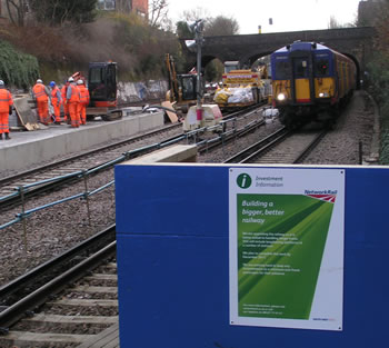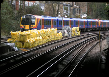 Construction materials lie piled at the west end of Putney station on 28 December. Another train of class 450 units heads towards Barnes. |