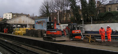 There were no services again on 1 and 2 January, whilst work was being done to lengthen platform one in the direction of Waterloo. This photograph was taken in mid-morning on 2 January, and it looked as if much work remained to be done in order for services to resume the following day. |