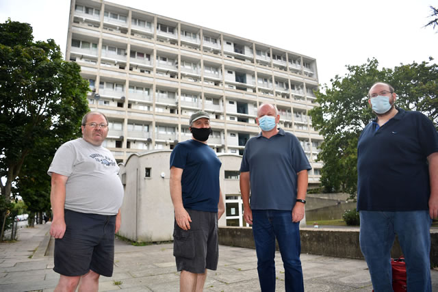 Tony Arthur, Ivan Regan, Angus Robertson and Matthew Tiller outside Allbrook House, which was set for demolition under the previous scheme