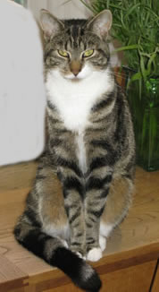He is 14 months old and quite timid. He has black and brown stripes on his back, tail and legs, a white chest and white socks on all paws.