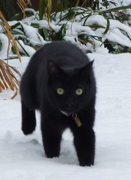 Large, long, lean completely black cat missing in the Holmbush Road / Kersfield Estate area. He's wearing a silver fluorescent collar with a tubular brass tag on it with our phone number inside.