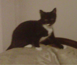 Coco is mostly black, with a white underbelly and white paws. She also has a white chin and a little white smudge leading up to her left nostril.