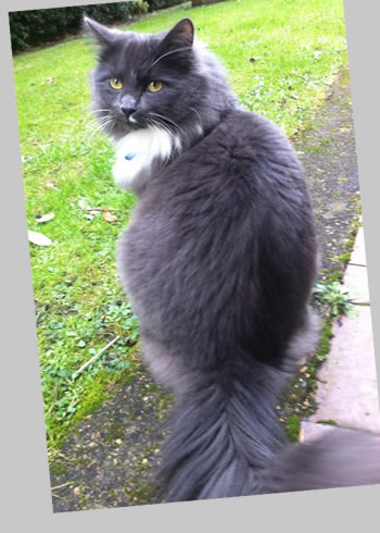 Psheel is a two year old long grey haired cat with white paws & tummy. He wears a blue collar and a pet tag with a bell.