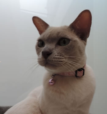 She is a lilac Burmese and is 18 months old and quite small. She has cream fur with a slightly greyer face and ears. She is wearing a pink collar with a bell and is microchipped.