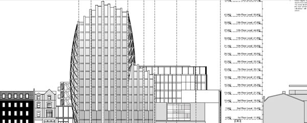 Architects plans show the 15 storey as seen from Putney Bridge Rd (top of a double decker shown on high street)