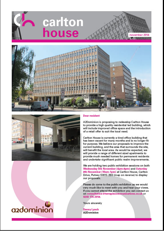 a2dominion wish to redevelop Carlton House into mixed use of housing, office space & retail space.The exhibition to display proposals for Carlton House will take place onsite from 10am to 1pm tomorrow. There will be signs to guide visitors and the venue is accessible from the Carlton Drive entrance to the building.