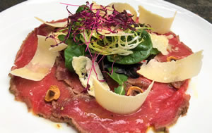 Seared organic beef carpaccio, toasted hazelnuts, aged parmesan, winter leaves *