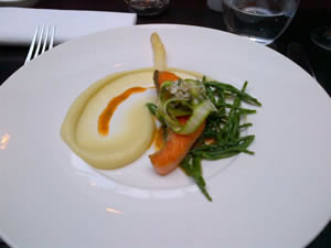 I had the slow roasted tomato soup with pesto crostini. I was assured there was no cream in the soup, although it tasted like it was full of it! To give you an idea of the size of the taster portions, it was served in a expresso cup. I also went for the citrus cured salmon with gazpacho consomme. The gazpacho was a real flavour sensation - a much stronger taste than I expected from its pale appearance. Other starter choices on the "Taster's Menu" featured octopus, wood pigeon and ham hock terrine.