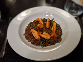 My friends too the fish and seafood route with the Sea Bream from the festive menu, which sits on sauteed broccoli, potatoes and capers with a lemon dressing and the third went for the sauteed prawns which are cooked with white wine and garlic and served on lentils.