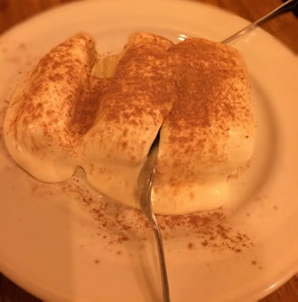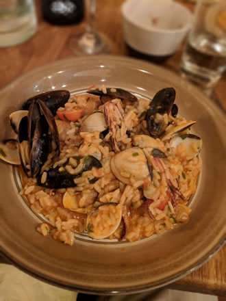 Accompanied by a delicious Pinot Grigio (£23.95) recommended by the waiter when he discovered that wine we had chosen was not chilled enough. Our main courses arrived promptly and we enjoyed a very tasty bowl of Risotto di Mare - a generous serving with mussels, clams, squid, king prawns & cherry tomatoes (£13.95).