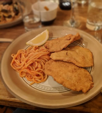 The Cotoletta alla Milanese (£11.95) was delicious - perhaps a salad or wilted spinach should have been ordered to get one of the 'five a day' - the tomato and basil sauce with the pasta was delicious and most obviously made with fresh ingredients and not form a can or jar! If allergic to cheese be aware there is parmesan in the sauce not just grated over the dish at the table.
