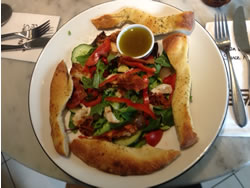 The salads on offer were very tempting and I opted for the Pollo Pancetta salad (£8.60) with dressing "on the side" - a generous bowl of green leaves, chicken & pancetta (obviously) with peppers, sweet baby onions, vine tomatoes, cucumber with basil and mint plus dough sticks which were heavenly!