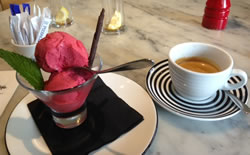 I treated myself to an Oddono's raspberry sorbet with chocolate 'straw' & fresh mint - less than 100 calories if you have the mini version of one ball, but I mistakenly ordered the full size (still under 200 calories!) accompanied by a double espresso.