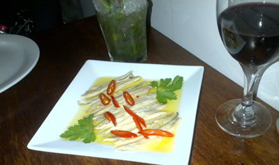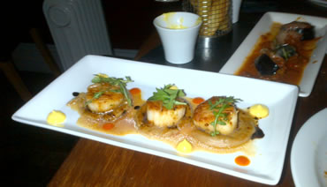 A good glass of Spanish red and a Mohito from an excellent, imaginative cocktail menu set us up for testing the wide range of tapas that is the speciality of the house. Knowledgeable waitresses Aiste and Antonia explained the menu and suggested around 3 items each which was about right for us. The choice is from appetizers, platters featuring in particular a 24 month acorn fed Iberian ham, tortillas, vegetarian, meat and fish tapas. To give an idea of the terrific choice offered we tried chilli flaked anchovies, baked aubergine in a tomato sauce with melted Manchego, chunky potato bravas (amazing chips with a spicy dipping sauce), crispy pork belly in red wine (my favourite!), seared queen scallops and crispy fried calamari with aioli sauce, topped off with a shared almond cake and fabulous ice cream.