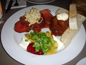 Priced at £6, this offered both variety and value for money as individual salads range in price from £3.50 to £5. We went for the Imam bayaldi (a spiced Turkish aubergine dish) which was resplendent with the flavours of soft aubergine, tomato, cumin, coriander and olive oil. A salad of pickled beets (red and yellow) was nicely crunchy and not overly vinegared. It was topped with some wonderfully pert and fresh baby watercress and goat’s curd. Only a celeriac remoulade with some tasty bresaola slighty let this display down with, a remoulade that was a touch too mustardy.