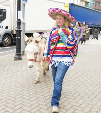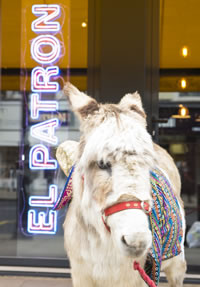A donkey hit the pavements of Putney today (10th February) in honour of the launch of new Mexican late night bar, El Patron. Accompanied by a poncho clad team of admirers he donned a local policeman's hat, stopped for selfies with fans and even popped into the tube to purchase a travel card. He wasn't giving rides despite many offers from passers by who brayed with delight at seeing a donkey in the middle of the day, seeming more interested in the delicious tacos and burritos available at El Patron.