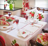 cottons. Glamorous cushions and bedlinen for the "Boudoir" or 50's style "frilly pinnys for the kitchen. Launching Spring 2013 is a new PVC gardening range, seat cushions, picnic mats and outdoor eating items. |