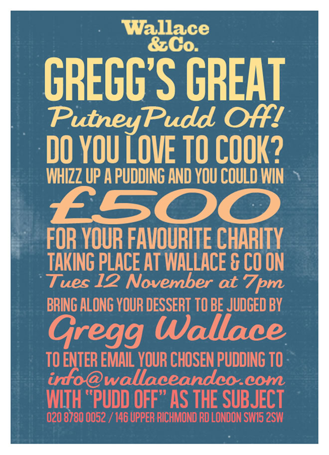 On 12th November at 7pm Gregg will be at 146 Upper Richmond Rd (the restaurant!) to judge puddings brought in to the restaurant.