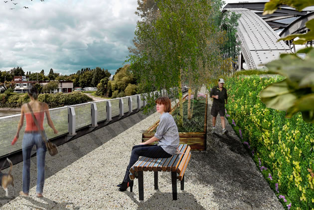 one world design architects are assisting at the early stages of the design process. They envisage planters placed along the promenade and a screen (possibly living) wall between live railway line and new promenade to prevent trespassers etc. The existing metal clad upstand to the riverside could be removed and replaced with a glass balustrade to allow greater views for all and from further back along the bridge – this will also make the bridge appear lighter from the riverbank.