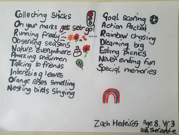 Entrants were asked to compose a poem of not more than 100 words in praise of the Gardens, on a theme of “How does Coronation Gardens affect your senses?â€. Zach, a Year 3 pupil at Sheringdale Primary School, came out tops with the judges after they had considered over 20 entries. His effort had imaginatively listed the many benefits of park life using the first letters of the Garden’s name.