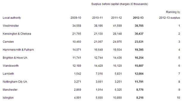 The authority with the largest surplus in 2012-13 was Westminster with £39.7 million. The four biggest earners were all London authorities with only Brighton, Nottingham and Manchester breaking into a top ten dominated by councils in the capital.