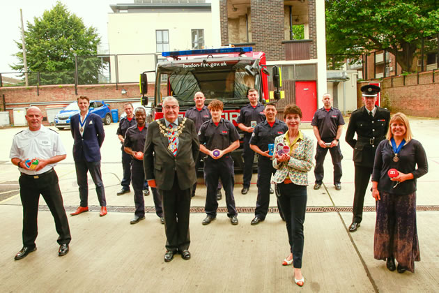 The Mayor of Wandsworth and Paddy Rowe with the firefighters. Picture: Tammy Marlar