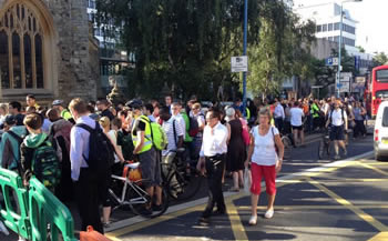 Commuters both pedestrian and cyclists, are struggling to cross Putney Bridge on the one pavement open to them whilst the bridge is closed for re-surfacing for a minimum of three months.