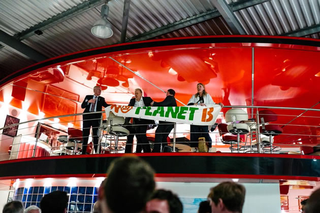 Members of Extinction Rebellion (XR) Wandsworth unfurled a ‘No Planet B’ banner from a balcony at the Joe Macari Performance Cars in Merton as Education Secretary Nadhim Sahawi started to speak.