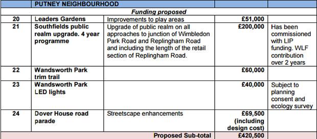 Other neighbourhood schemes being recommended for funding include the Quest employment scheme in Queenstown, a trim trail in Wandsworth Park, a refurbished ball pen on Wandsworth Common, landscaping in Falcon Park and improvements to the Dover House Road parade in Putney