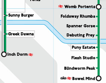 Visitors & residents travelling on the Cist Dirt Line will pass through Beduting Prey (Putney Bridge) over the Thames to Puny Estate, (East Putney) moving on to Flesh Studio (Southfields) on the way to the end of the line at Bowel Mind (Wimbledon).