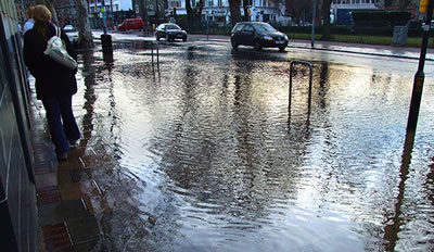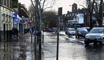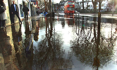 A burst water main flooded part of Chiswick High Road on Tuesday 22nd January. The water also covered a stretch of pavement and made it impossible for pedestrians to use bus stops and a number of the High Road crossings.