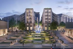 The new square, to be built on the site of the now demolished Earls Court Exhibition Centre, The Exhibition Square plans will form the eastern gateway to the development and its new high street, including a public square and gardens, shown here, plus a hotel, offices and an entrance to Earls Court Underground station.
