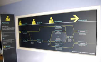 A range of signs throughout the department convey essential information to patients at each stage of their care. These use simple language to ensure a consistent and clear message is given to patients and relatives, allowing them to better understand their journey through the department.