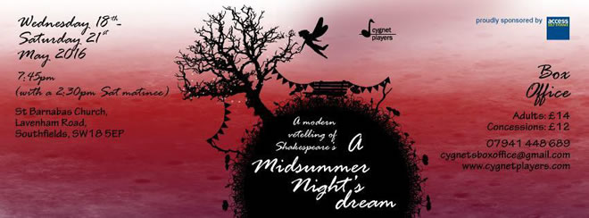 Cygnet Players are performing a modern re-telling of William Shakespeare’s most popular comedy, A Midsummer Night’s Dream. The production runs from Wednesday, 18 May to Saturday, 21 May 2016 at St Barnabas Church, Lavenham Road, Southfields, SW18 5EP. Performances are nightly at 7.45pm with a 2.30pm Saturday matinee.
