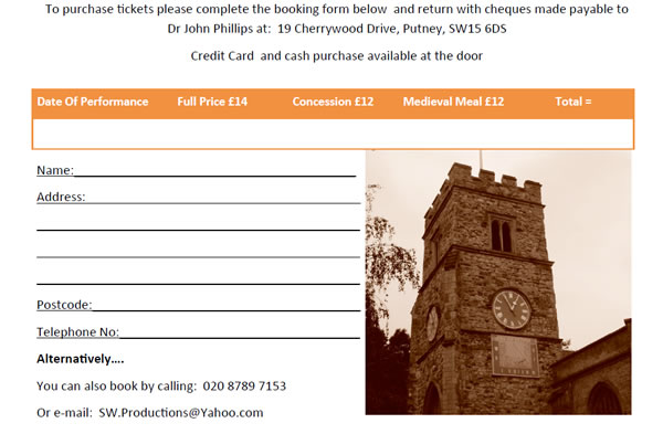 A medieval-style meal will be offered to complement the performance (tickets purchased separately £12; joint ticket (theatre/meal) £22). For more information re the meal, please contact Putney Pantry on 0208 789 1137 or info@putneypantry.com.