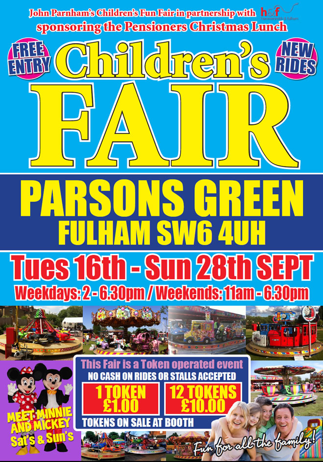 Parnham's kids funfair comes to Parsons Green with a great range of rides and inflatables for children. With guest ppearances at the weekends from Minnie & Mickey Mouse.