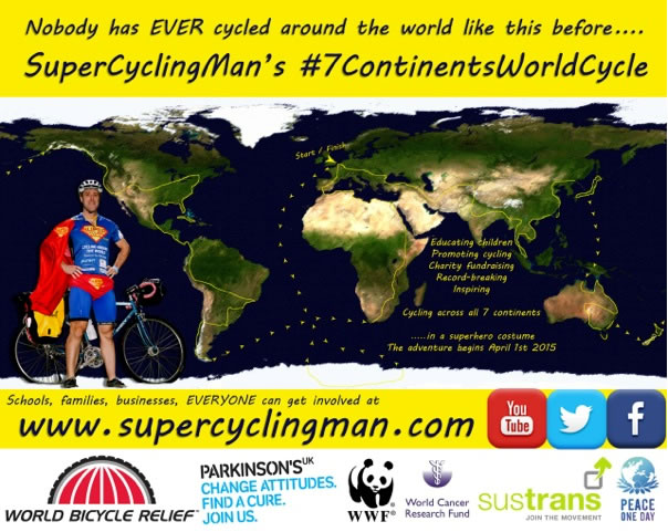 He is pedalling round the planet for many reasons, including: to raise £100,000 for charity, to educate children about the world and to encourage children and adults to be more active and get on their bikes.