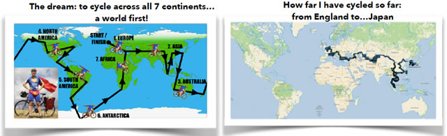 "On May 31st I set off from London on a 5-year long, 100,000km bike ride that will take me across every continent on the planet, even Antarctica!