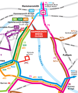 The 72 bus from from East Acton, via White City and Shepherd's Bush, is diverted in both directions via Fulham Palace Road, Putney Bridge, Lower Richmond Road and Mill Hill Road, rejoining its normal route at Rocks Lane in Barnes.
