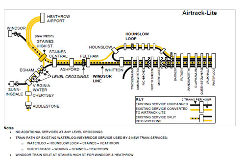 Two existing services on the Waterloo-Windsor line would split at Staines to provide a further direct link to Terminal Five. Two services an hour would also come up from Weybridge to Heathrow - again without adding extra frequencies over level crossings at Egham.