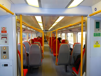 The new trains can be identified from the front by the substantially larger quantity of yellow paint than existing trains. Unlike the existing blue-coloured trains, they do not ‘screech’ as they start and stop, and they do not contain any first-class seating. Inevitably there will be the odd teething problem upon introduction into service, and one coach was experiencing door problems for the first couple of days; a technical assistant was travelling on the train to assist with such problems.