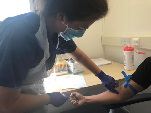 Maria, a senior phlebotomist, taking blood samples from staff who attend for antibody testing