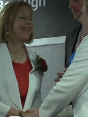 Mary Macleod congratulates Ruth Cadbury. Pic - chiswickbuzz tv